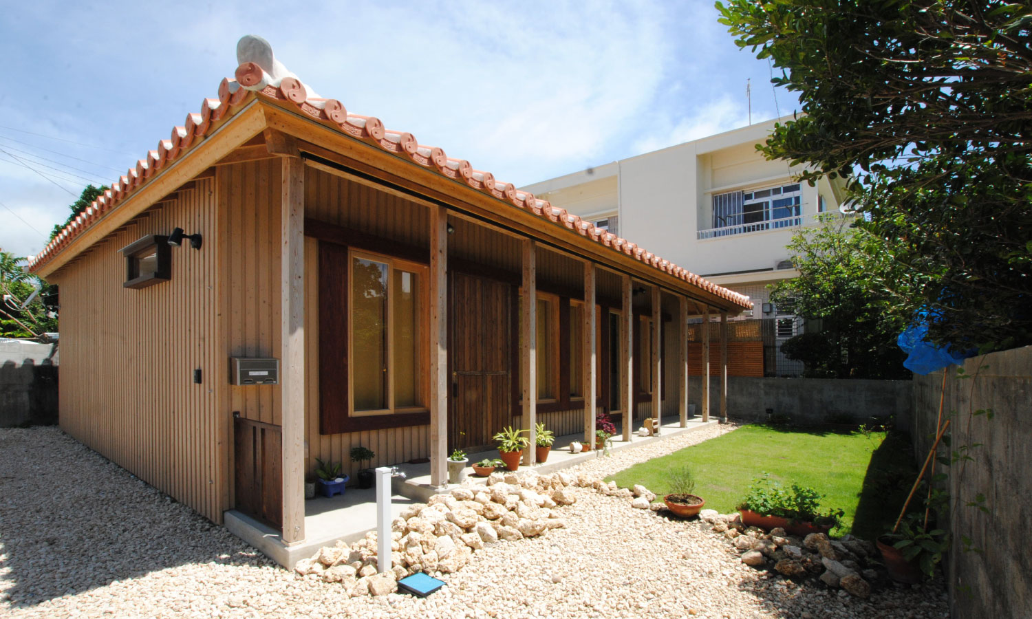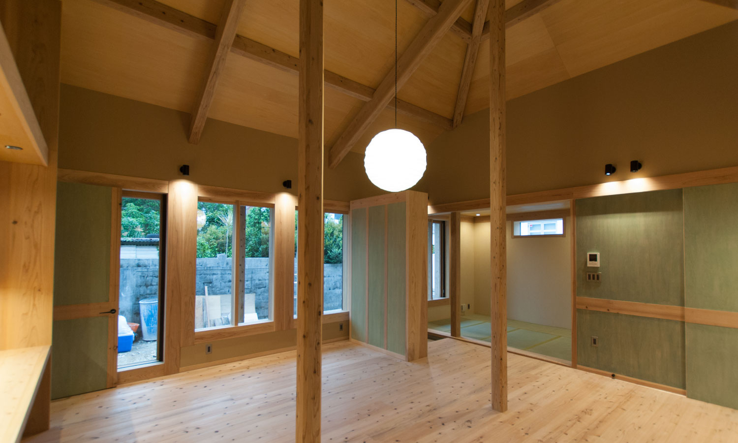 A modern Ryukyu house with an open-plan living room with high ceilings.